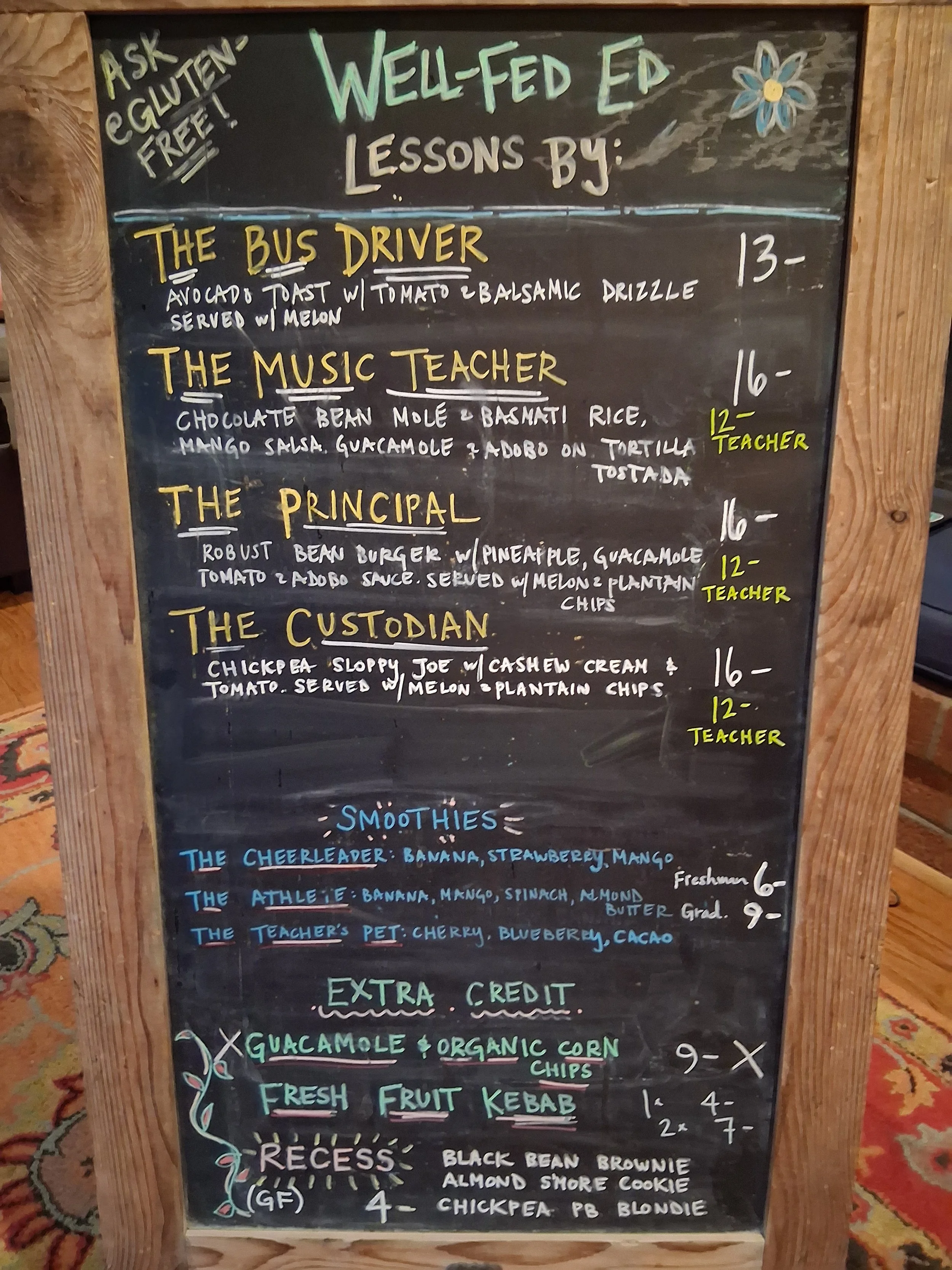 Hellllloooo Nurse! Our scrumptious Chick Pea “Chicken” Salad wrap with organic red grapes, celery and Almond slivers will cure what’s ailing you. Enjoy the beta carotene powerhouse, mandolin cut Sweet potatoes on the side.